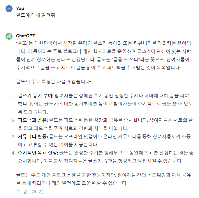 ChatGPT의 소개와 같이 글또란 글 쓰는 또라이가 세상을 바꾼다는 슬로건을 갖고 활동하는 글 쓰는 개발자들의 모임 입니다. 활동기간 동안 예치금으로 10만원씩 걷어 글을 안 쓸 경우 예치금이 차감되기에 글쓰기에 강제성이 어느 정도 부여되며 글을 쓰고는 싶은데 의지가 부족할 때 참여하면 정말 좋은 모임이고, 글쓰기 이외에도 ChatGPT가 알려주는 것처럼 온오프라인 밋업이 활발하게 진행하며 같은 직군부터 IT 분야에 소속된 다른 직군의 사람들과도 다양하게 교류할 수 있는 모임입니다.